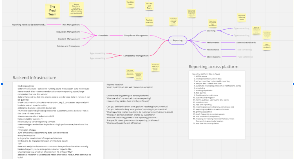 The methodology for discovery was interview-style conversations with internal participants where I attempted to glean pain points, short and long-term goals of the verticals in the reporting space, and barriers to solutions.