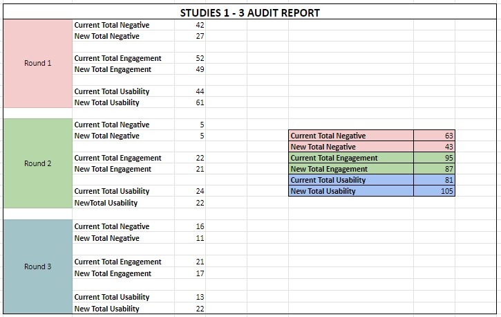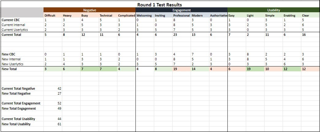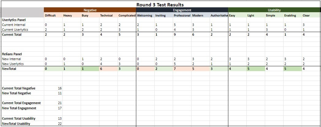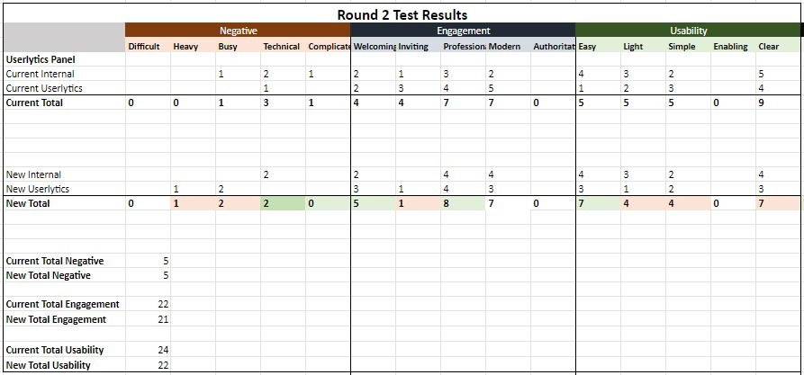 The results across all three studies are basically the same, and the new design typically wins in two of the quantitative categories compared; the Negative and Usability categories. The New design frame came in second in the Engagement category in each of the three rounds of testing but it was close. The New design is still not provoking enough participants in the Engagement word category.