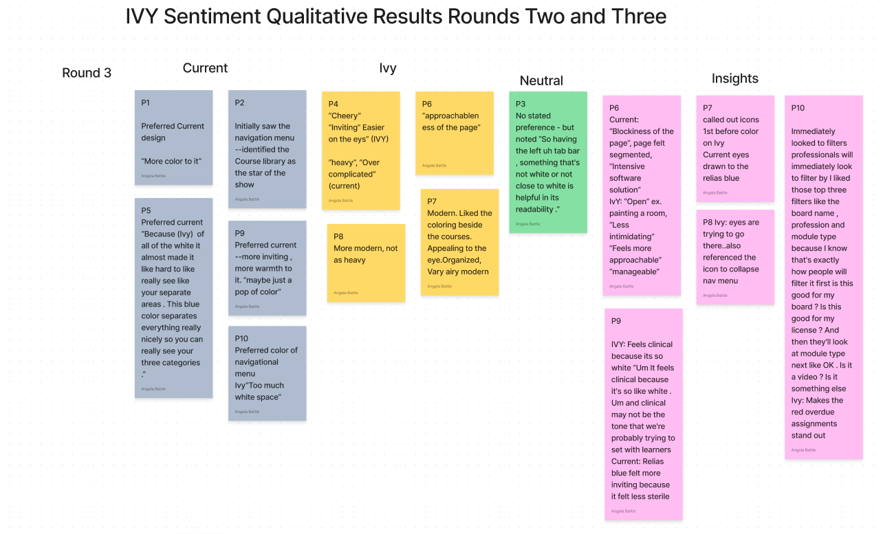 This chart was used to analyze the quantitative results with my primary stakeholder. The Current LMS design frames collected approximately 60% more Negative feeling sentiment across all studies. Next, the Current design frame scored slightly more Engagement sentiment feelings topping the New design by 8 points across all studies. While the Current design inspired more Engagement, the margin was slim. In Usability. the New design system frames garnered more word tallies across all three studies. We also discussed the qualitative results. Overall, the Current design was seen as "easier" to understand how to navigate. This was associated with the use of color to help direct the eye to a starting point. Users who preferred the New design frame remarked that it felt "bright" and "airy" but did not direct the eye to a starting point. All of this feedback was shared in a final report out with the primary stakeholder and the design team.