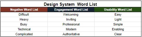 The Director of UX and I devised a word list for participants. The words selected were intentional and were used to allow participants to convey their impressions of the current versus the new UI designs. Each participant was asked to select five words during the testing. The word tallies were then counted and compared to determine which designs scored higher in Negative, Engagement, and Usability sentiment.