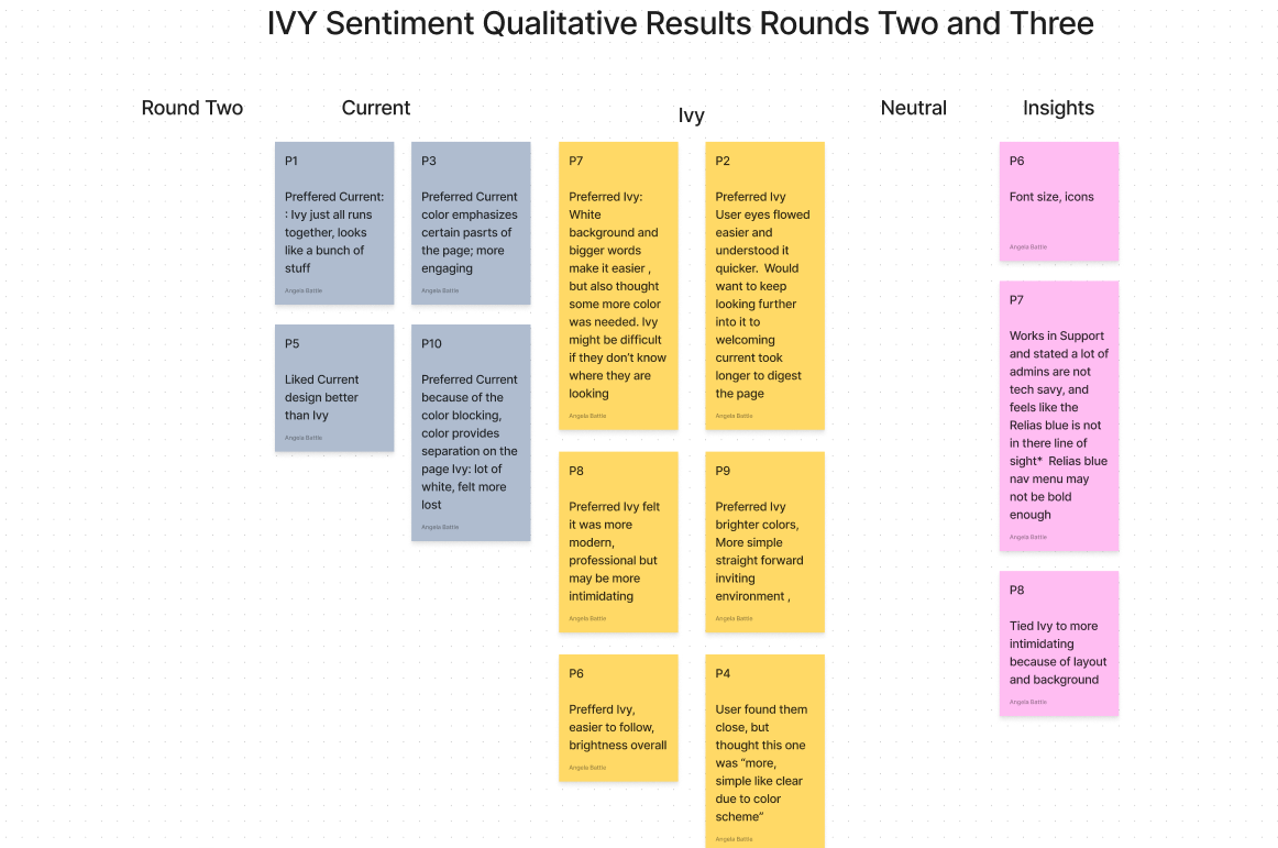 In Study 2, I changed from an unmoderated to a moderated study, pared down the number of participants, and was able to gather more insight into why word selections were made. In round 2 of the study, The Negative word selections and sentiment were tied 5 - 5 between the Current and New design frame. The Current design frame still slightly edged out the New design frame 22 - 21 in Engagement feelings. In this study, Usability for the Current design frame collected more word tallies than the New design frame 24 - 22 which was different than Study 1 results. Because it was a moderated study, I had the opportunity to question why certain word selections were made. As I reviewed the feedback I also created a Figjam board to capture important quotes and sentiments.