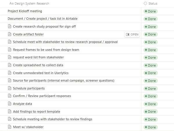 This series of studies began as a remote unmoderated study. After recognizing that I could not capture qualitative feedback, the study was modified to a remote moderated study. It taught me to consider if I could capture all the data I needed prior to the study launch. In hindsight, I also recognized the visual aids I used to convey the findings in the PowerPoint artifact needed a bit more description, and perhaps additional charts versus raw numbers. Overall, I was satisfied that all the necessary steps were taken into account for order and familiarity bias by sourcing for participants both inside and outside of the organization (with varied levels of comfort with the LMS), changing the order of the frames displayed with each participant, and randomizing the word selection order.